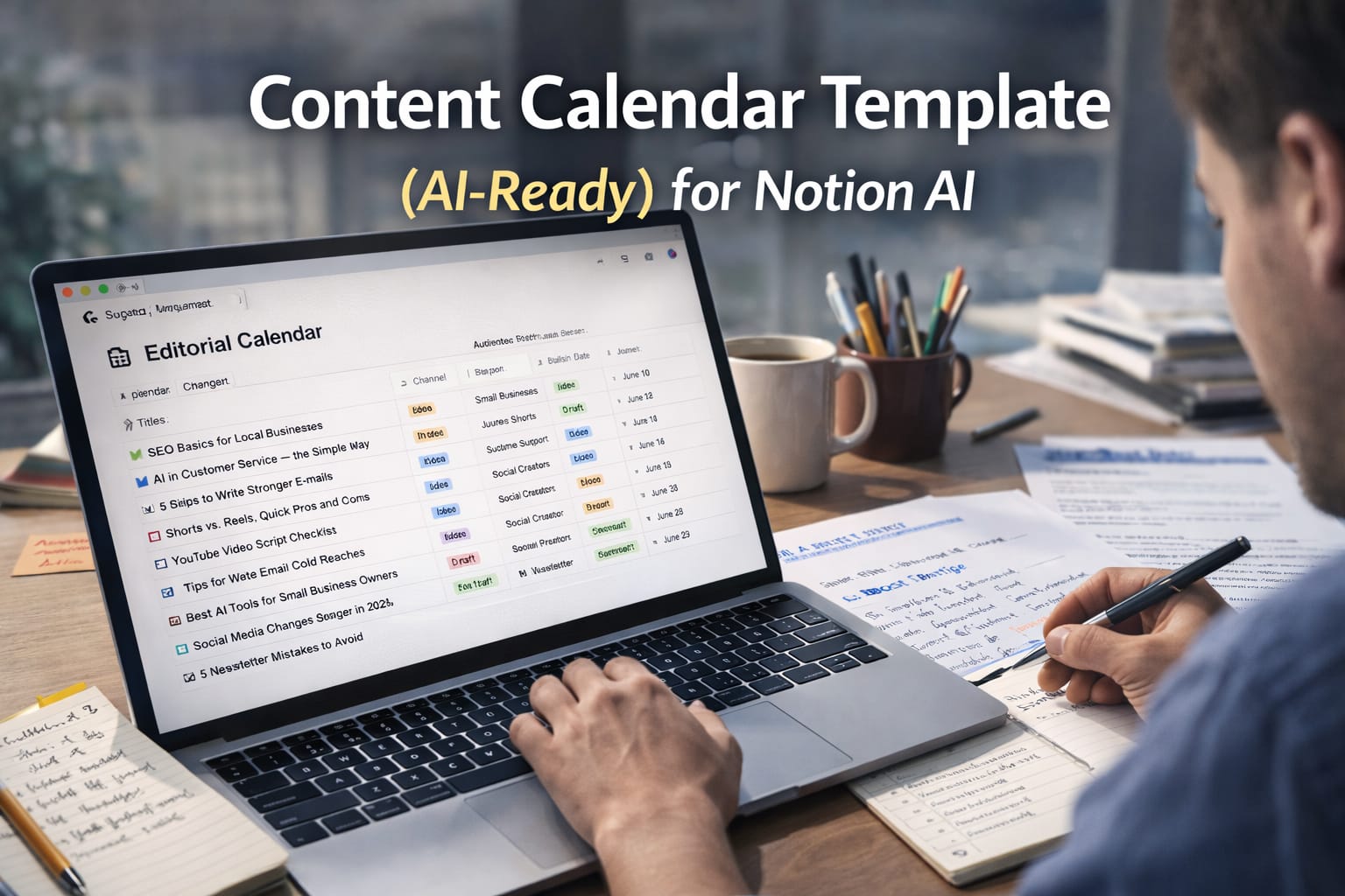 Content Planning • Notion AI • 2026 Content Calendar Template (AI-Ready) for Notion AI A good content calendar is more than dates and titles. In 2026, the best calendars are “AI-ready”: they store the right context so Notion AI can generate ideas, briefs, outlines, and drafts that actually match your brand. Best for: Blogs, shorts, reels, newsletters Works with: Notion + Notion AI Goal: Plan + draft faster If you’ve ever tried to stay consistent with content, you already know the real problem: it’s not writing a post once. It’s…